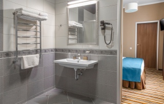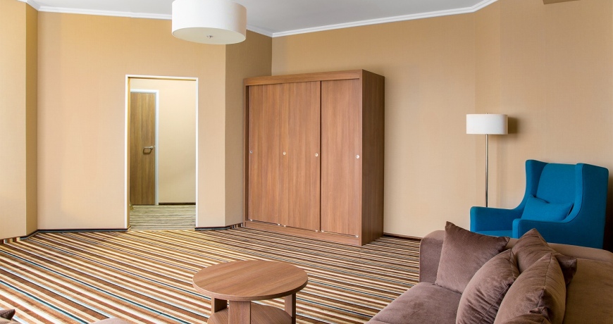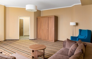 Two-roomed apartment has a wonderful view over the town hall. It is an ideal variant for work, business meetings and family rest. It includes a cosy bedroom, a spacious living room with work area and lounge zone, a hall and a bathroom. Maximum capacity - 4 guests. Area - 65 sq.m. Bed - 180*200 cm (King size). Extra bed - a sofa (150*200 cm). The apartment also features plasma TV.